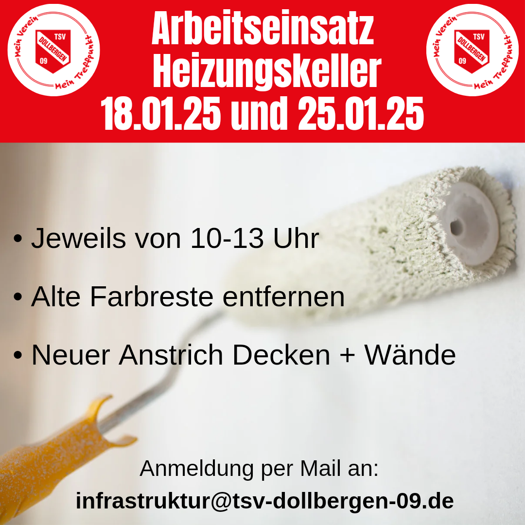 unsere neue Heizungsanlage ist fertiggestellt, und in diesem Zusammenhang möchten wir dem Heizungskeller einen neuen Anstrich verleihen. Zudem planen wir einen "Tag der offenen Tür", bei dem die Photovoltaikanlage und die Wärmepumpe vorgestellt werden. Um den Heizungskeller entsprechend herzurichten, haben wir zwei Arbeitseinsätze geplant. Die Arbeitsstunden werden selbstverständlich angerechnet. Somit hätte der Einzelne seinen Jahreseinsatz (3 Stunden) erledigt.