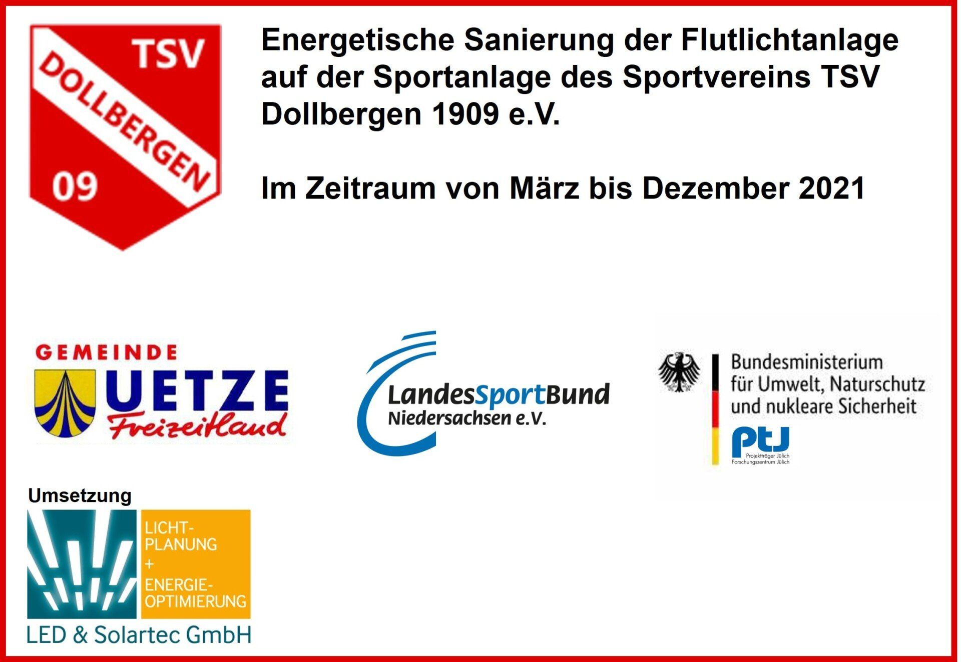 Der Platz ist jetzt gleichmäßig super ausgeleuchtet. Nach Aussage unserer Trainer sind es klasse Trainings- und Spielbedingungen. Neben der guten Ausleuchtung spart der Verein ca. 60 % der bisherigen Energiekosten und somit wird auch entsprechend CO2 eingespart. Wir bedanken uns für die entsprechende Förderung durch Bundesmittel PTJ, sowie Mittel vom Landessportbund und der Gemeinde Uetze. Mit dieser Förderung war es möglich unsere Anlage wettbewerbsfähig herzurichten.