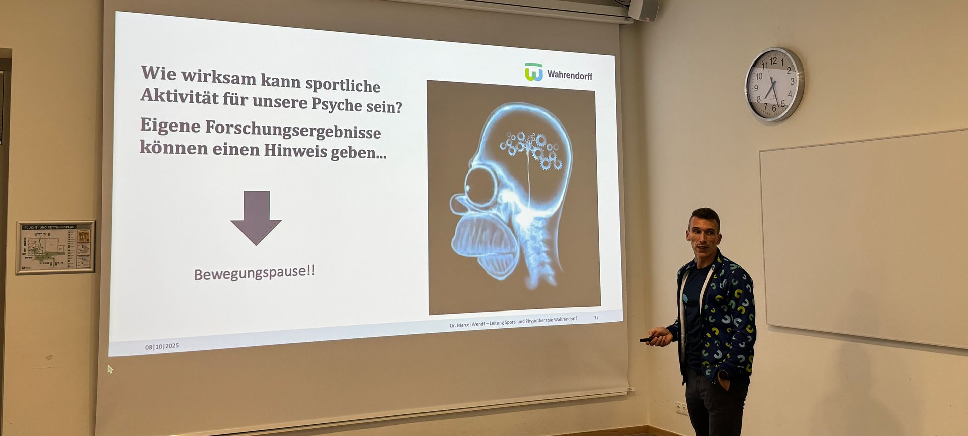 Dr. Wendt erläuterte zudem die physiologischen Wirkmechanismen hinter dem positiven Einfluss von Sport: von der Aktivierung des serotonergen Systems über die Förderung der adulten Neurogenese bis hin zur Ressourcenverschiebung im Gehirn, die kognitive und emotionale Entlastung ermöglicht. Auch praktische Empfehlungen zur langfristigen Motivation – etwa durch feste Trainingszeiten, Gruppendynamik oder digitale Hilfsmittel – wurden anschaulich vermittelt.